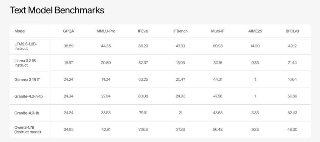 The flagship general-purpose model is LFM2.5-1.2B-Instruct. Liquid AI reports benchmark results across a range of reasoning and instruction-following evaluations, including GPQA, MMLU Pro, IFEval, and IFBench.